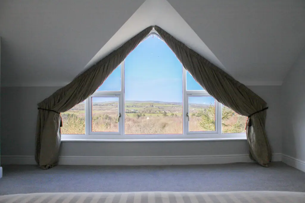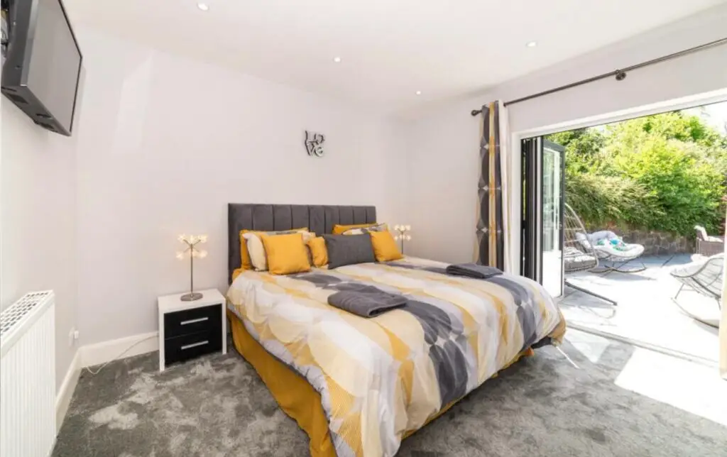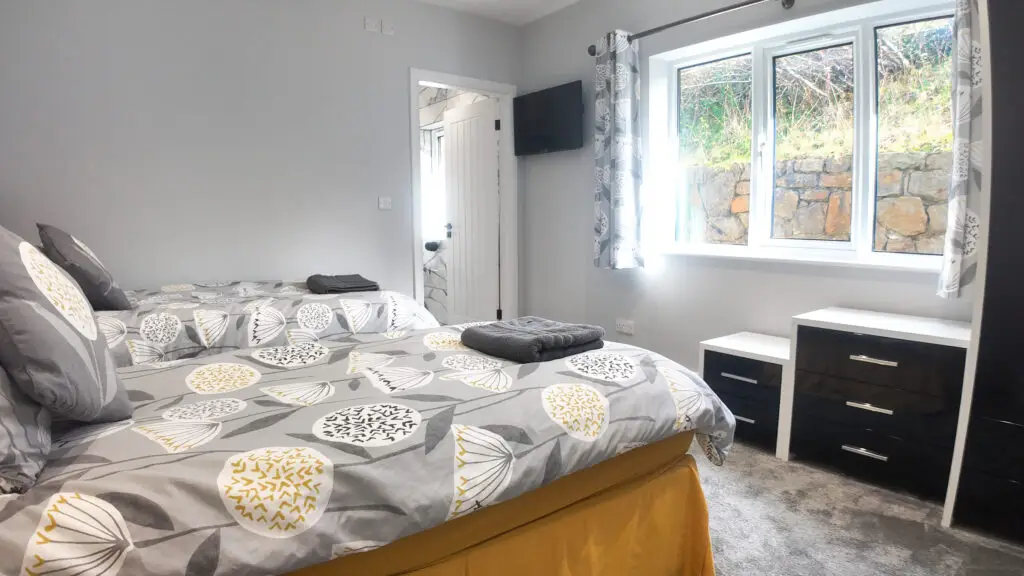 Bedroom one opens straight onto the patio through French doors, letting the outside flow in. Bedroom two looks out across the countryside and features its own private sauna — perfect for unwinding in peace. Bedroom three offers twin beds, ideal for children or friends, while bedroom four sits upstairs with elevated sea views — easily the most impressive outlook in the house.