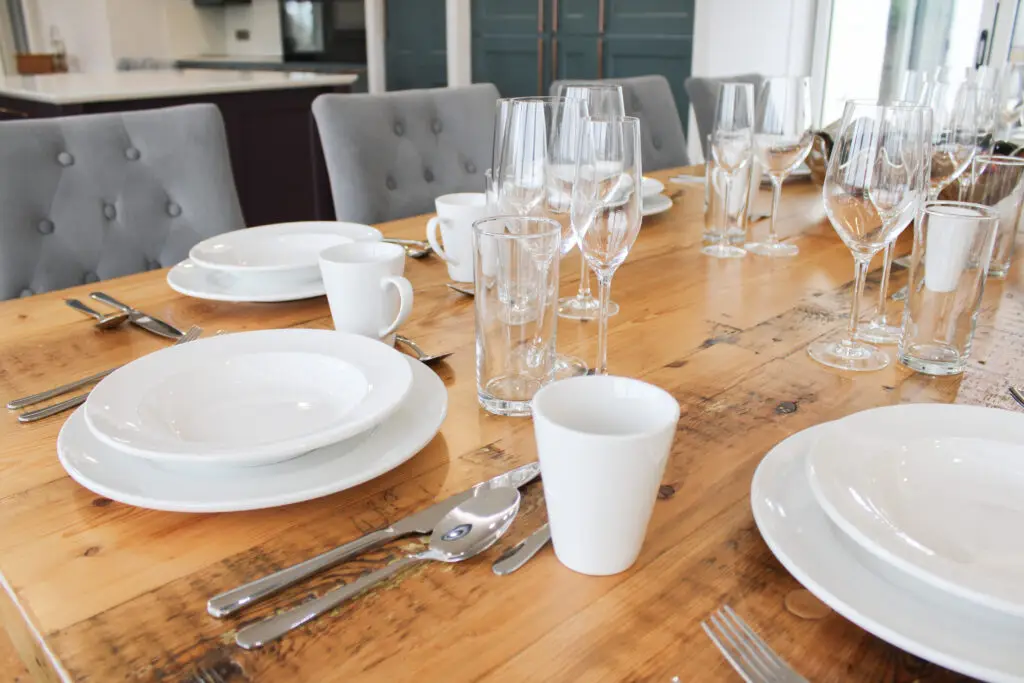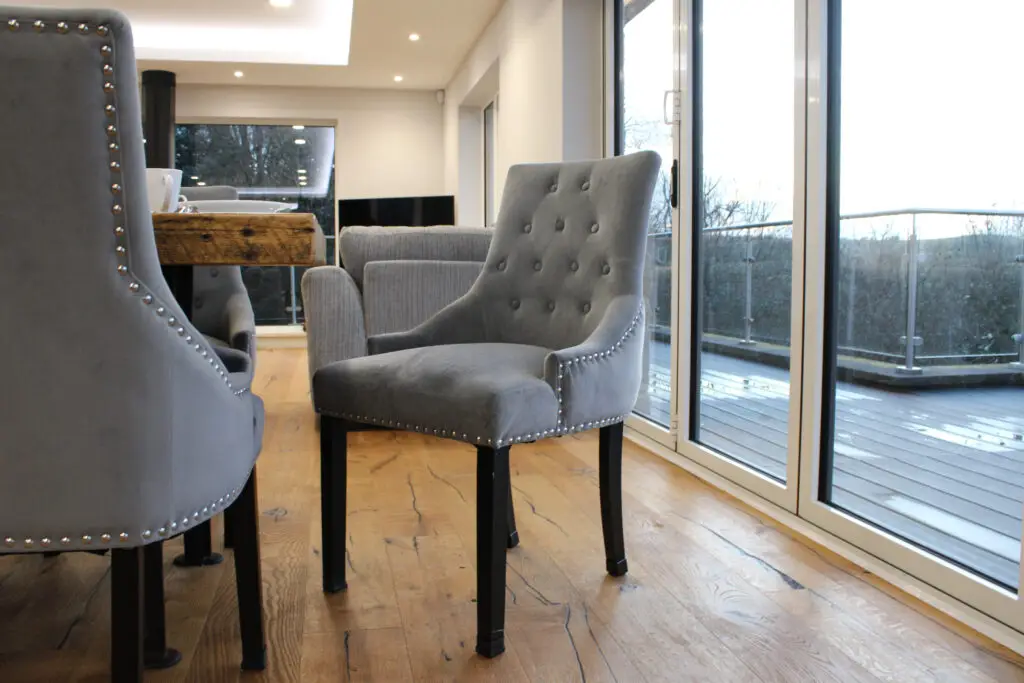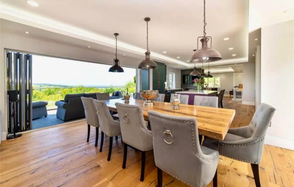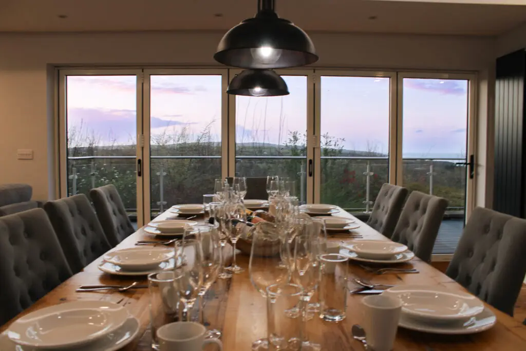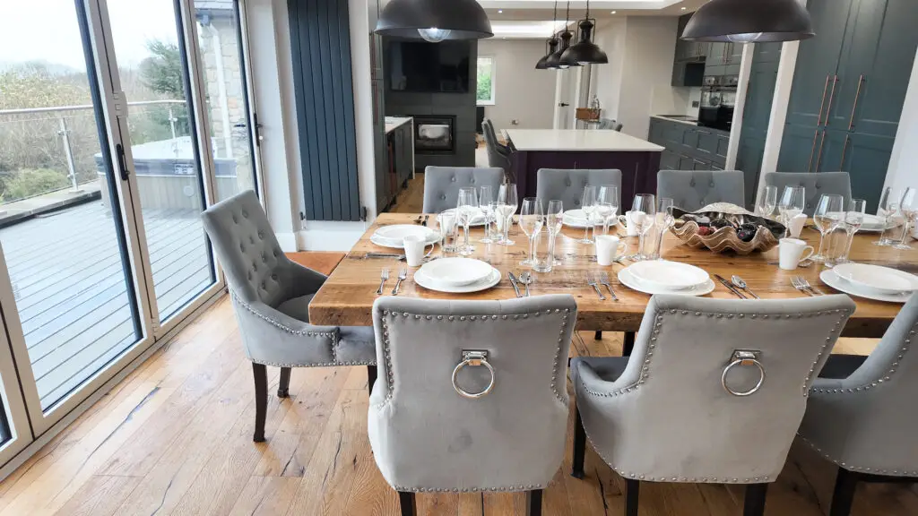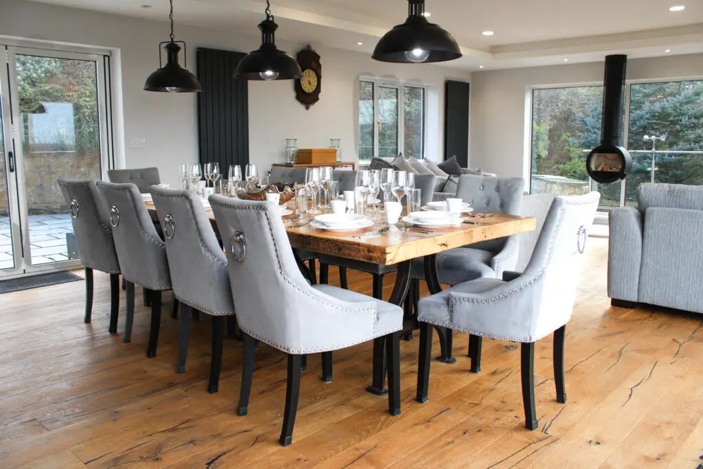 At Skyline House, the dining room is set up for the latter. A solid oak table seats ten comfortably, paired with high-backed upholstered chairs that make lingering over a long dinner feel entirely natural. Industrial-style pendant lights hang above, adding warmth without distracting from the real centrepiece — the view.