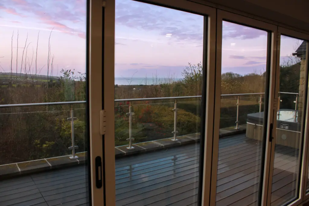 The bi-fold doors open directly onto the wraparound balcony, letting the outside in on warmer evenings — perfect for pre-dinner drinks as the sun drops over the sea, or coffee as the morning mist lifts across the forest below.