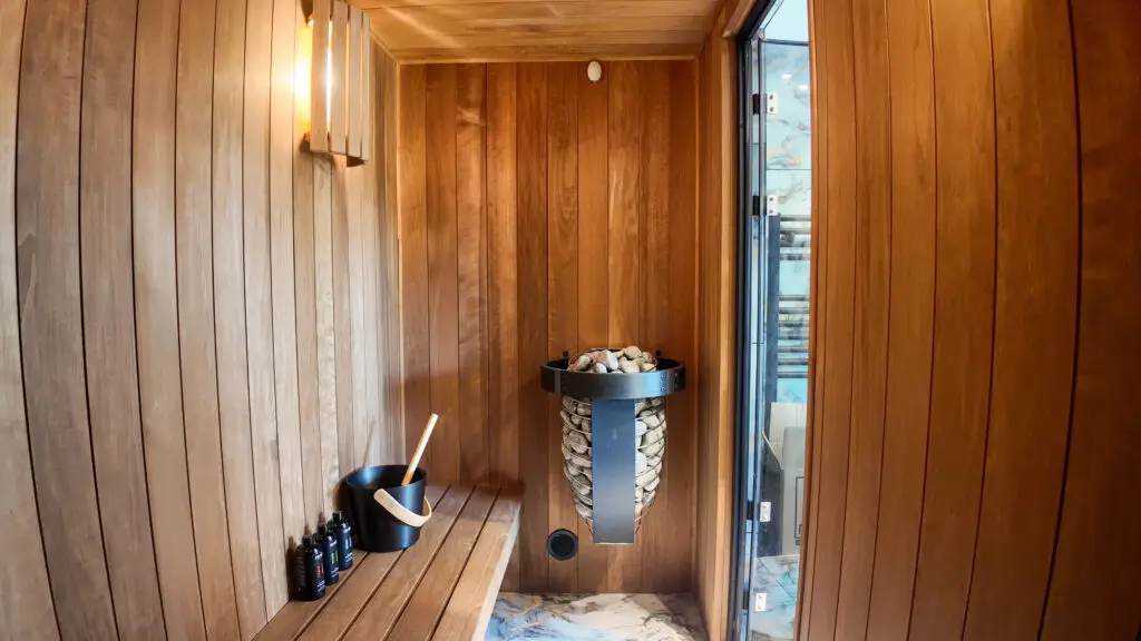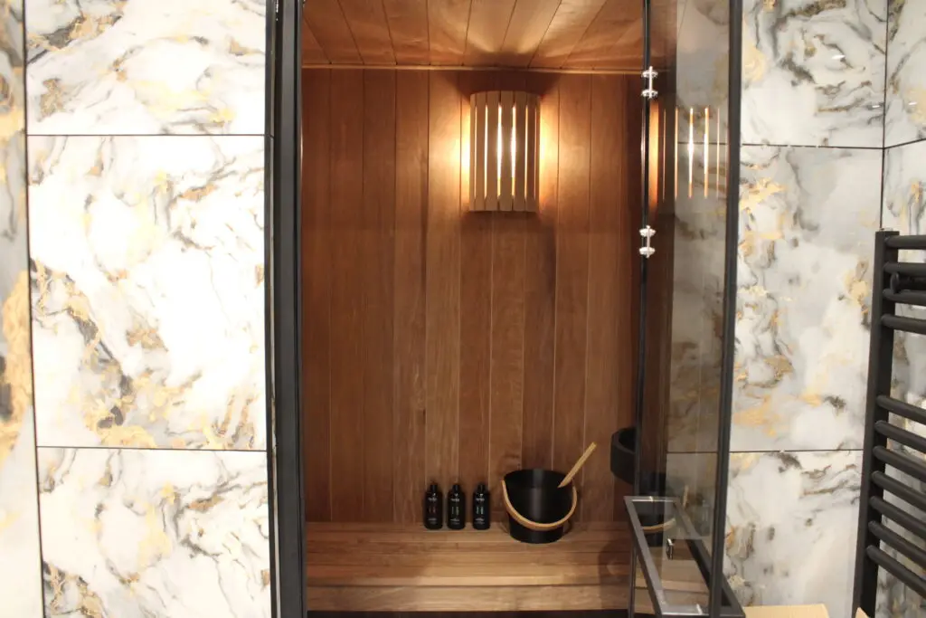 Tucked within one of the bedrooms at Skyline House, a private cedar sauna adds a genuinely luxurious dimension to your stay. Lined in warm timber with a traditional stone heater, it’s a proper sauna experience — complete with Rento sauna scents and a ladle bucket, so you can create exactly the atmosphere you want.