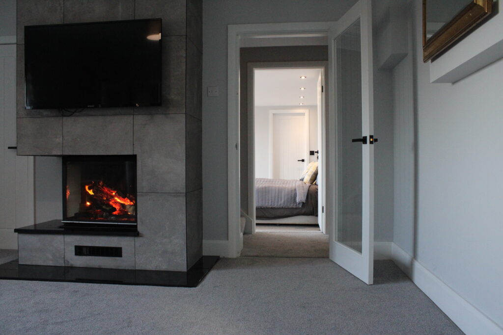 A cosy armchair sits by the window, ideal for an afternoon with a book while the fire burns quietly beside you. Natural light fills the room during the day, and in the evenings the fire does the rest.