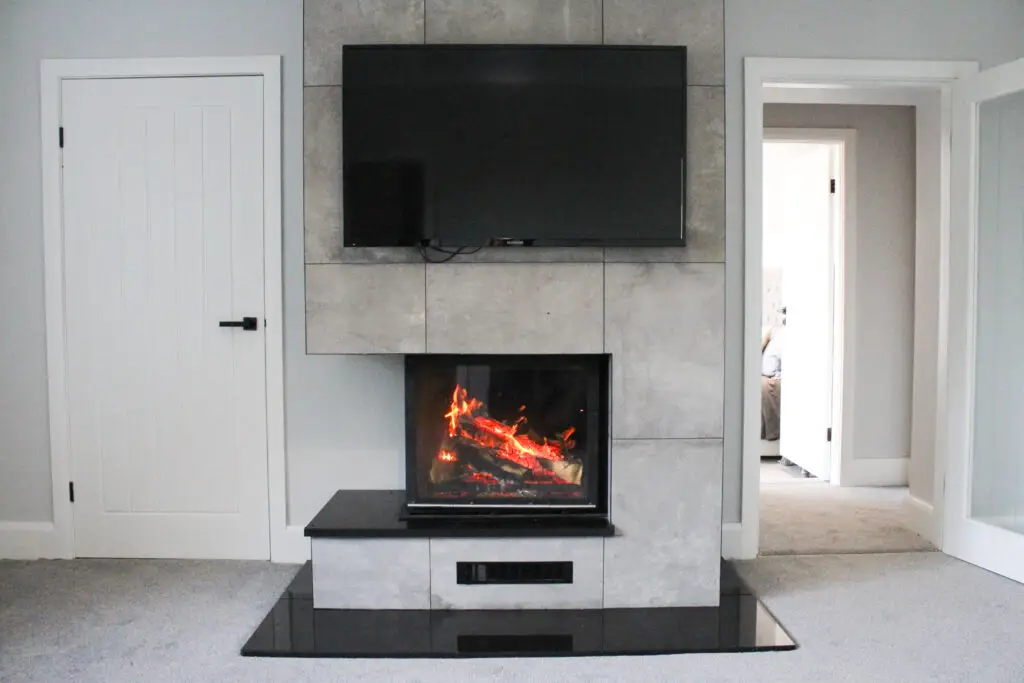 At its heart sits a concrete-framed fireplace with a wide log burner, paired with a large wall-mounted TV and a deep corner sofa in soft blue — everything you need for a proper film night without having to negotiate with the rest of the group over what to watch.